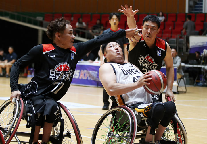 [서울=뉴시스] 12일 오후 제주 한라체육관에서 열린 '2025 KWBL 휠체어농구리그' 대구광역시청과 수원무궁화전자 경기에서 대구 백상하(가운데)이 무궁화 유교식(왼쪽)과 서영동의 수비수 사이에서 슛을 쏘고 있다. (사진=한국휠체어농구연맹 제공) 2025.09.12. [email protected] *재판매 및 DB 금지