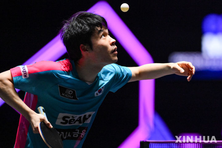 [마카오=신화/뉴시스] 장우진(28위)이 12일(현지 시간) 중국 마카오에서 열린 2025 월드테이블테니스(WTT) 마카오 챔피언스 남자 단식 16강전에서 쉬페이(45위·중국)와 경기하고 있다. 장우진이 3-0(11-7 11-7 12-10)으로 이기고 한국 선수로는 유일하게 8강에 올랐다. 2025.09.13.