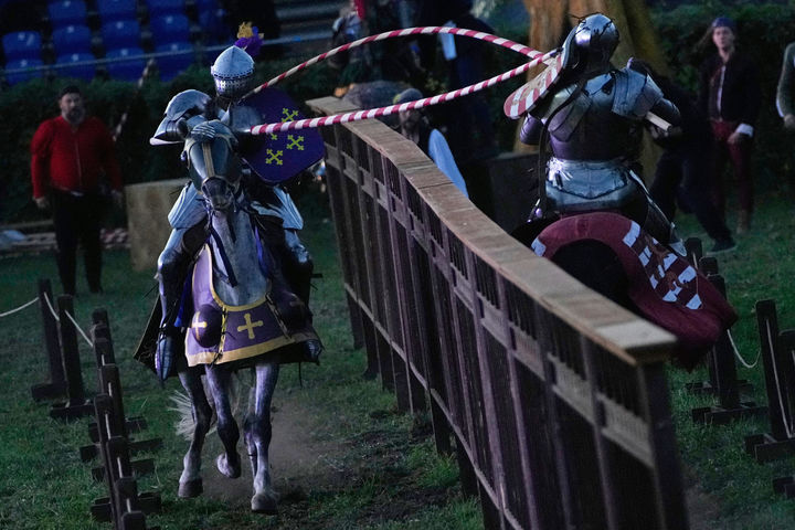 [모스크바=AP/뉴시스] 12일(현지 시간) 러시아 모스크바 차리치노 공원에서 열린 중세 기사들의 결투를 재현하는 '세인트 조지 토너먼트'에서 중세 갑옷을 입은 참가자들이 마상(馬上) 창 경기를 펼치고 있다. 2025.09.13.