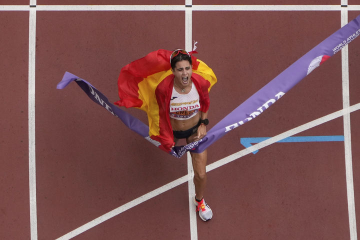 [도쿄=AP/뉴시스] 마리아 페레스(스페인)가 13일 일본 도쿄에서 개막한 2025 도쿄 세계육상선수권 여자 경보 35㎞에서 자국 국기를 들고 1위로 결승선을 통과하고 있다. 페레스는 2시간39분01초의 기록으로 금메달을 목에 걸었다. 2025.09.13.