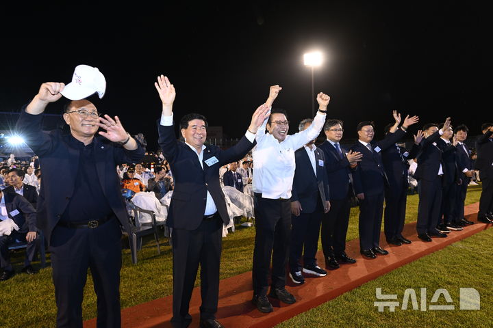 [고창=뉴시스] 김종효 기자 = 지난 12일 고창군 공설운동장에서 열린 '제62회 전북특별자치도민체육대회' 개막식, 남원시 선수단이 입장하자 왼쪽부터 류흥성 남원체육회장, 김영태 남원시의장, 최경식 남원시장 등이 환호하고 있다. (사진=남원시 제공) 2025.09.13. [email protected]
