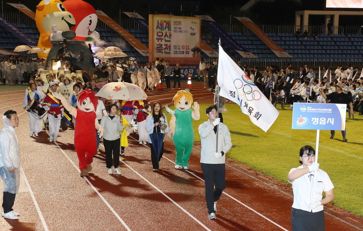[정읍=뉴시스] 김종효 기자 = 지난 12일 고창군 공설운동장에서 열린 '제62회 전북특별자치도민체육대회' 개막식, 정읍시 선수단이 입장하고 있다. (사진=정읍시 제공) 2025.09.13. [email protected]