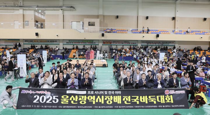 [울산=뉴시스] 구미현 기자 =울산광역시장배 전국바둑대회가 13일 울주종합체육센터에서 열린 가운데 김두겸 울산시장, 김기현 국회의원, 김철욱 시체육회장, 양재호 한국기원 사무총장, 천정곤 울산시바둑협회장, 프로기사 등 대회 참석자들이 기념촬영을 하고 있다. (사진=울산시 제공) 2025.09.13. [email protected]