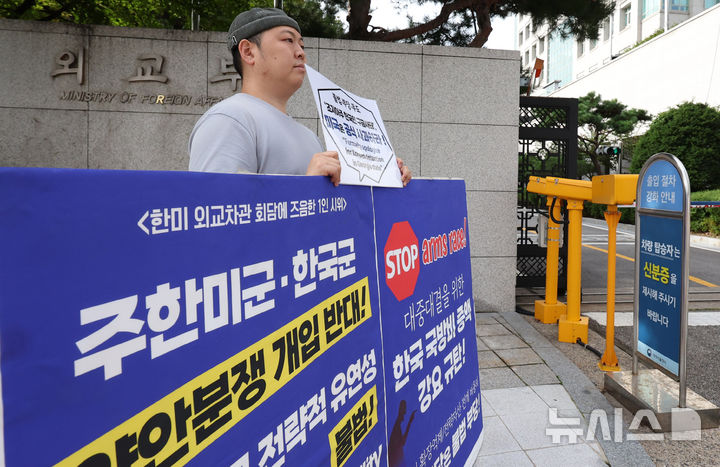 [서울=뉴시스] 추상철 기자 = 평화와통일을여는사람들이 14일 오전 서울 종로구 정부서울청사 별관 외교부 앞에서 '한미 외교차관 회담에 즈음한 1인 시위'를 하고 있다. 2025.09.14. [email protected]