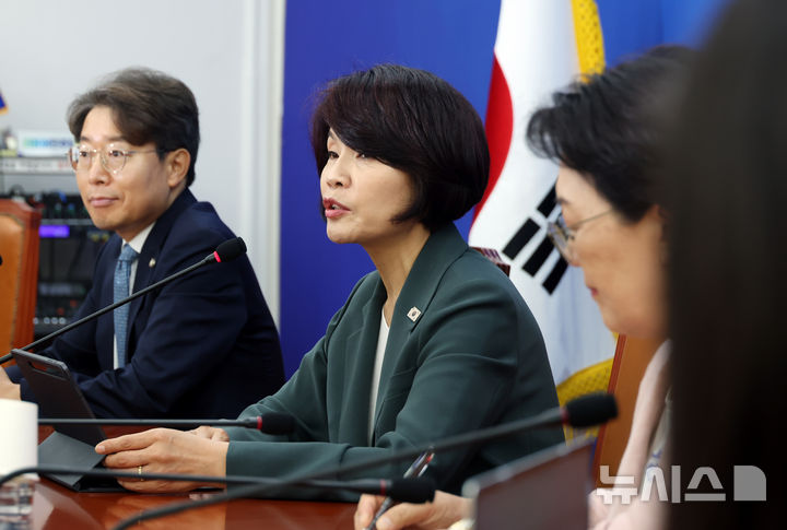 [서울=뉴시스] 고승민 기자 = 더불어민주당 한정애 정책위의장, 최기상 정책위 사회수석부의장, 권향엽 대변인이 14일 서울 여의도 국회에서 현안 기자간담회를 하고 있다. 2025.09.14. [email protected]