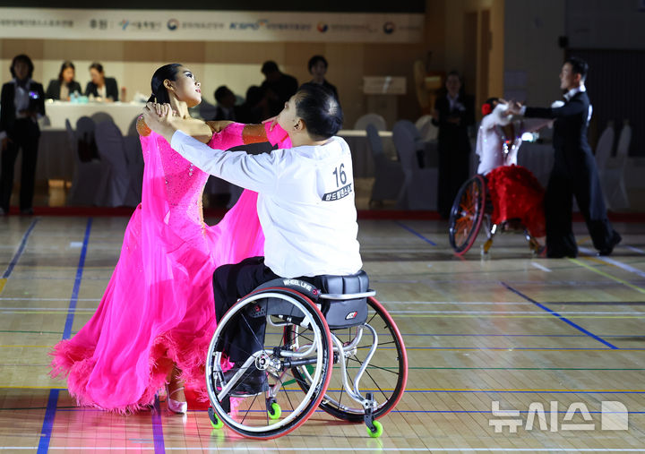 [서울=뉴시스] 박주성 기자 = 14일 서울 서초구 서초종합체육관에서 열린 2025 서울특별시장배 전국장애인댄스스포츠 선수권대회(제3차 국가대표선발전)에서 참가 선수들이 대회를 치르고 있다. 2025.09.14. [email protected]