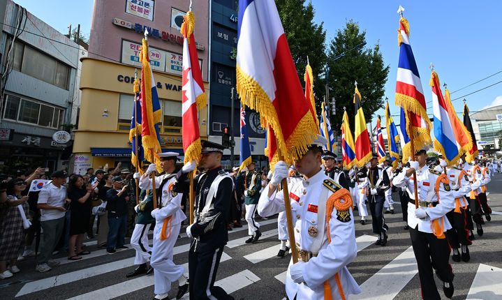 [서울=뉴시스] 14일 동인천역 남광장 일원에서 열린 제75주년 인천상륙작전 기념 거리퍼레이드에서 각군 의장대가 이동하고 있다. (사진=인천시청 제공) 2025.09.14. [email protected] *재판매 및 DB 금지