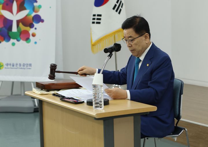 [서울=뉴시스] 15일 경기 성남 새마을운동중앙회에서 열린 '2025 새마을운동글로벌리그(SGL) 총회'에서 김광림 새마을운동중앙회장이 개회를 선언하고 있다. (사진=새마을운동중앙회 제공) 2025.09.15. [email protected] *재판매 및 DB 금지