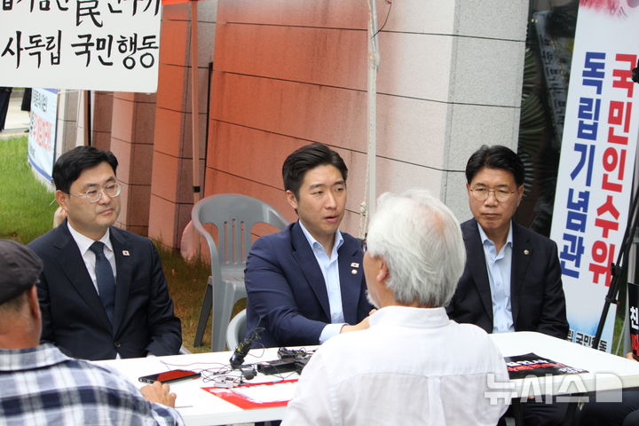 [천안=뉴시스] 최영민 기자= 16일 충남 천안시 목천읍 독립기념관 겨레누리관 앞에 꾸려진 김형석 독립기념관장 퇴진 농성장에 더불어민주당 김용만, 이정문, 이재관 국회의원이 방문해 농성에 참여하고 있는 독립운동가 후손들과 면담하고 있다. 2025.09.16 [email protected]