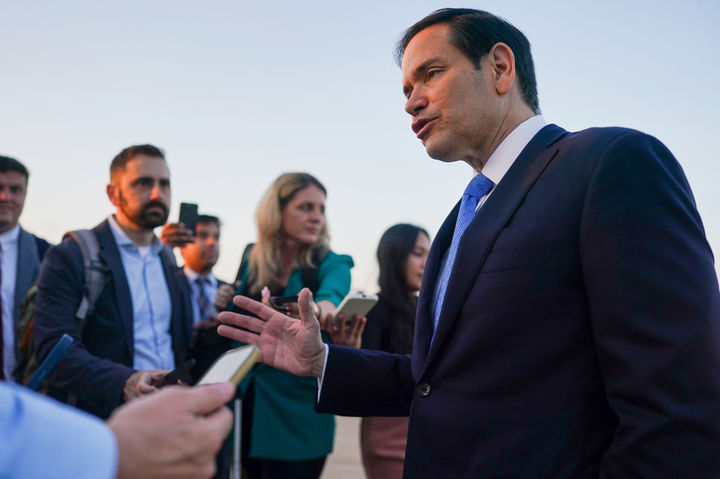 카타르로 떠나기 전 기자회견하는 루비오 장관