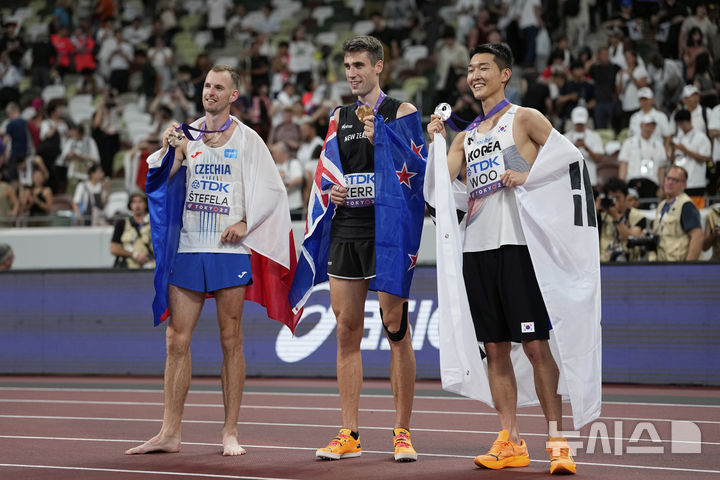 [도쿄=AP/뉴시스] 우상혁(오른쪽)이 16일 일본 도쿄 국립경기장에서 열린 2025 도쿄 세계육상선수권대회 남자 높이뛰기 결선에서 2m34로 은메달을 획득한 뒤 금메달의 해미시 커(뉴질랜드, 가운데), 동메달의 얀 스테펠라(체코)와 포즈를 취하고 있다. 2025.09.16.