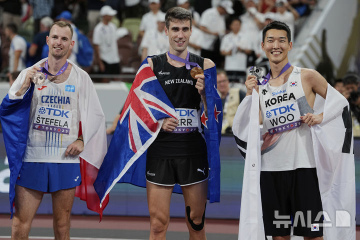 [도쿄=AP/뉴시스] 우상혁(오른쪽)이 16일 일본 도쿄 국립경기장에서 열린 2025 도쿄 세계육상선수권대회 남자 높이뛰기 결선에서 2m34로 은메달을 획득한 뒤 금메달의 해미시 커(뉴질랜드, 가운데), 동메달의 얀 스테펠라(체코)와 포즈를 취하고 있다. 2025.09.16.
