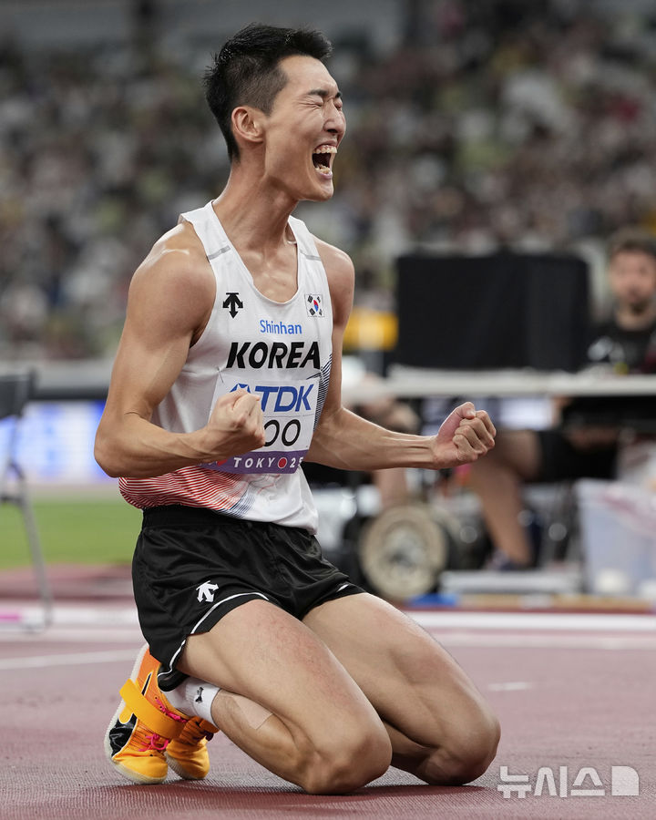 [도쿄=AP/뉴시스] 우상혁이 16일 일본 도쿄 국립경기장에서 열린 2025 도쿄 세계육상선수권대회 남자 높이뛰기 결선에서 환호하고 있다.