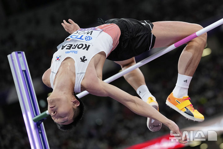 [도쿄=AP/뉴시스] 우상혁이 16일 일본 도쿄 국립경기장에서 열린 2025 도쿄 세계육상선수권대회 남자 높이뛰기 결선에서 경기를 펼치고 있다.