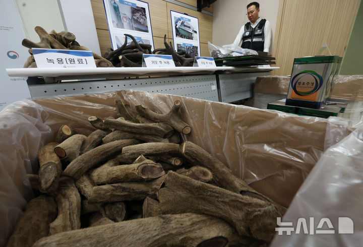 [서울=뉴시스] 홍효식 기자 = 16일 서울 양천구 서울지방식품의약품안전청 브리핑실에서 열린 무허가 의약품 녹용 절편 제조·판매·유통업자 적발 브리핑에서 무허가 녹용 원료가 놓여 있다. 2025.09.16. [email protected]