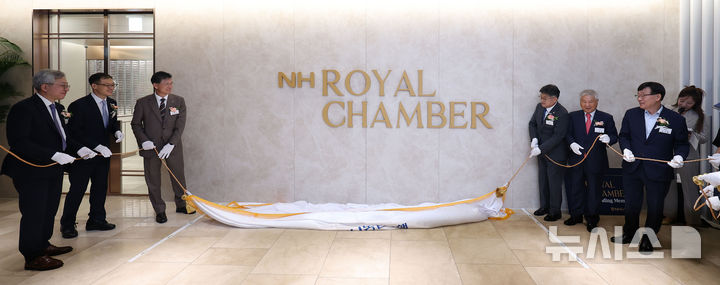 [서울=뉴시스] 김선웅 기자 = 16일 서울 서대문구 NH농협은행 본점에서 열린 최상위 고객 전용 프리미엄 자산관리 공간 'NH로얄챔버' 오픈 기념식에서 강태영 NH농협은행장, 김상욱 더불어민주당 국회의원 등 참석자들이 현판식을 하고 있다.