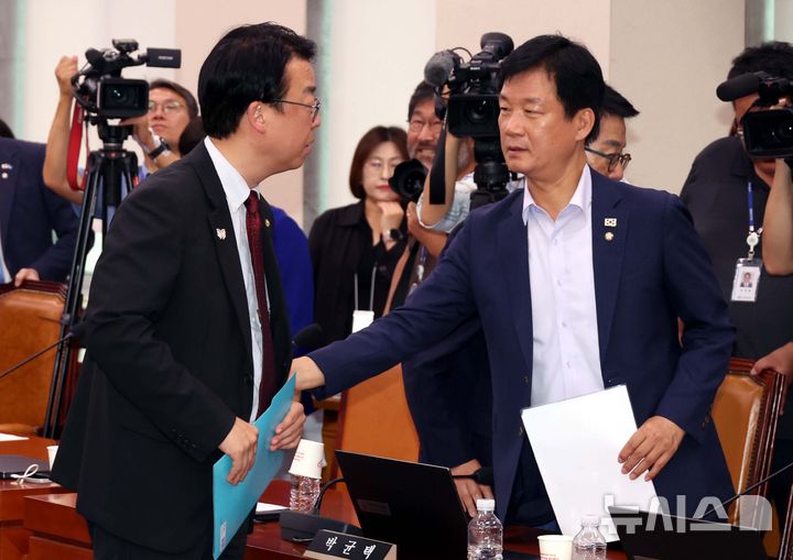 [서울=뉴시스] 조성봉 기자 = 박균택 더불어민주당 이의원이 16일 오전 서울 여의도 국회에서 열린 법사위 전체회의에서 곽규택(왼쪽) 국민의힘 의원과 대화를 하고 있다. 2025.09.16. [email protected]