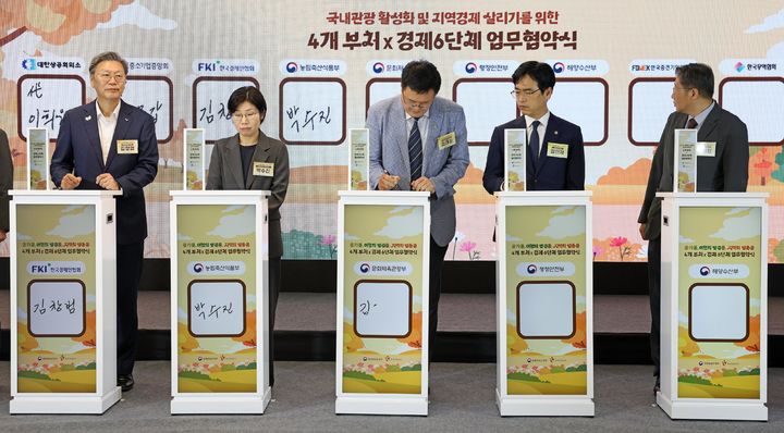 [서울=뉴시스] 김대현 문화체육관광부 제2차관이 16일 서울 중구 한국관광공사 서울센터에서 열린 지방살리기 범국민 여행 캠페인 '여행가는 가을' 선포식에 참석해 국내관광 활성화 및 지역경제 살리기를 위한 문체부, 행안부, 농식품부, 해수부, 경제6단체 간 업무협약서에 서명하고 있다. (사진=문화체육관광부 제공) 2025.09.16. [email protected] *재판매 및 DB 금지