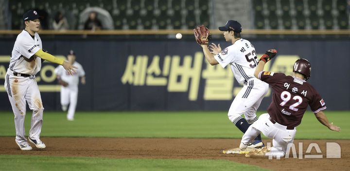 [서울=뉴시스] 정병혁 기자 = 16일 서울 송파구 잠실야구장에서 열린 2025 KBO리그 키움 히어로즈 대 두산 베어스의 경기, 4회초 2사 1루 상황 키움 김건희 땅볼 대 1루 주자 어준서가 2루에서 포스아웃되고 있다. 2025.09.16. [email protected]