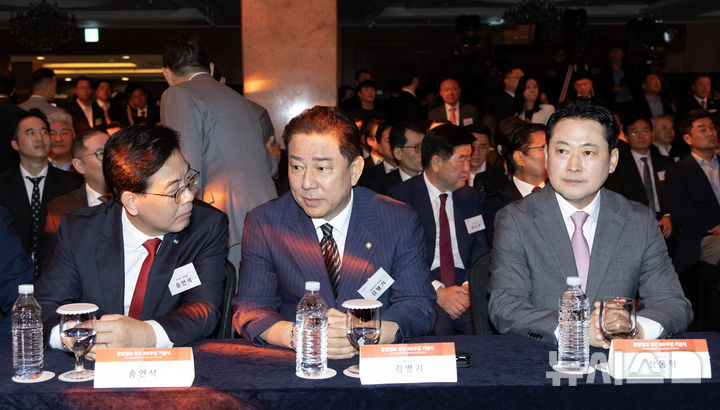 [서울=뉴시스] 국회사진기자단 = 김병기 더불어민주당 원내대표와 송언석 국민의힘 원내대표가 17일 서울 중구 롯데호텔에서 열린 중앙일보 창간60주년 기념식에서 대화하고 있다. 오른쪽은 장동혁 국민의힘 대표. 2025.09.17. [email protected]