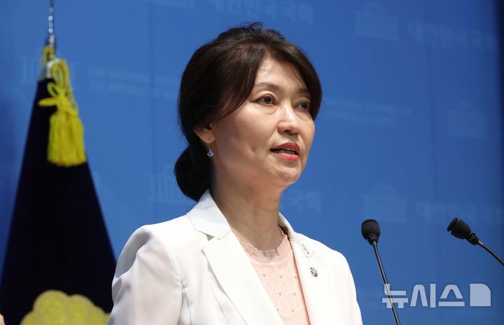 [서울=뉴시스] 조성봉 기자 = 강경숙 조국혁신당 의원이 17일 오전 서울 여의도 국회 소통관에서 열린 '경기교육청 고3 운전면허 372억 혈세낭비 관련 특성화고 역차별' 기자회견에서 발언을 하고 있다. 2025.09.17. [email protected]