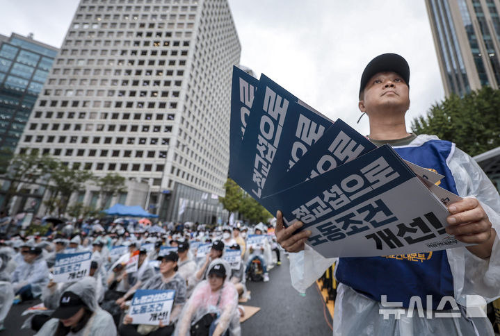 [서울=뉴시스] 정병혁 기자 = 17일 서울 중구 세종대로에서 열린 공공운수노조 의료연대본부 공동파업대회에서 참석자들이 피켓을 들고 있다. 2025.09.17. [email protected]