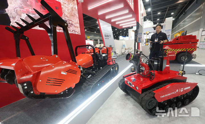 [서울=뉴시스] 홍효식 기자 = 17일 서울 서초구 aT센터에서 열린 2025 소방방재 기술 산업전에 산불 방재 로봇(왼쪽부터), 소화 로봇, 배수 로봇이 전시되어 있다. 2025.09.17. [email protected]