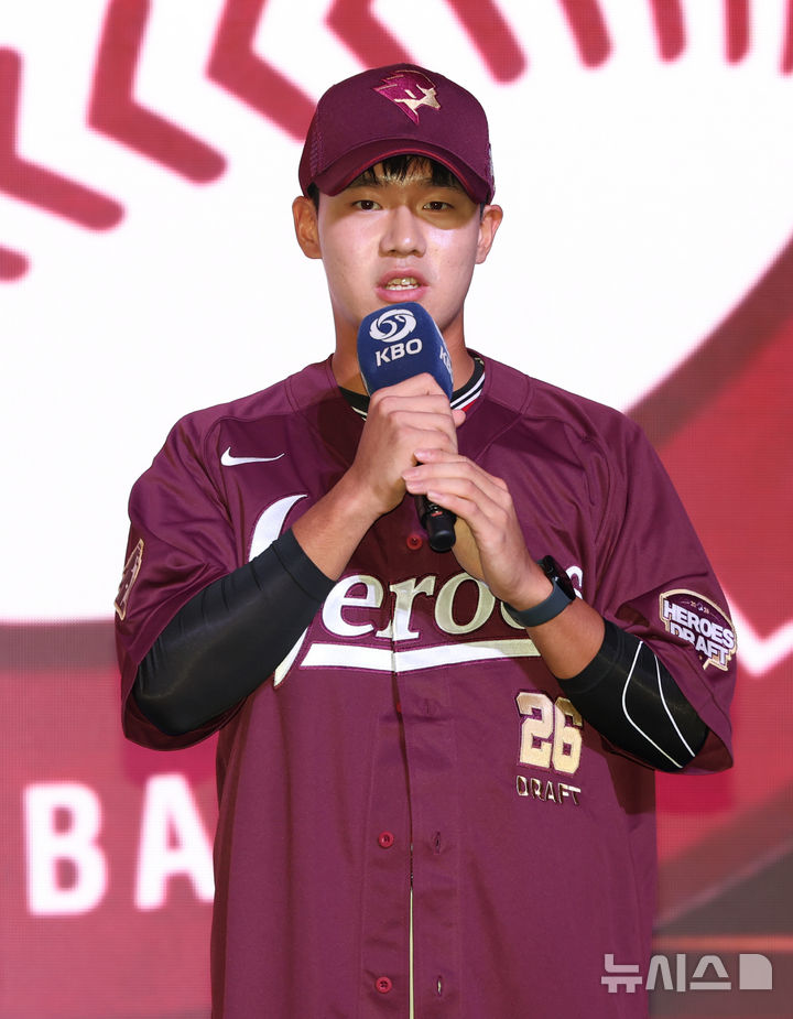[서울=뉴시스] 황준선 기자 = 17일 오후 서울 송파구 롯데호텔월드에서 열린 2026 KBO 신인 드래프트에서 키움 히어로즈 1라운드 지명된 전주고 박한결이 소감을 밝히고 있다. 2025.09.17. [email protected]
