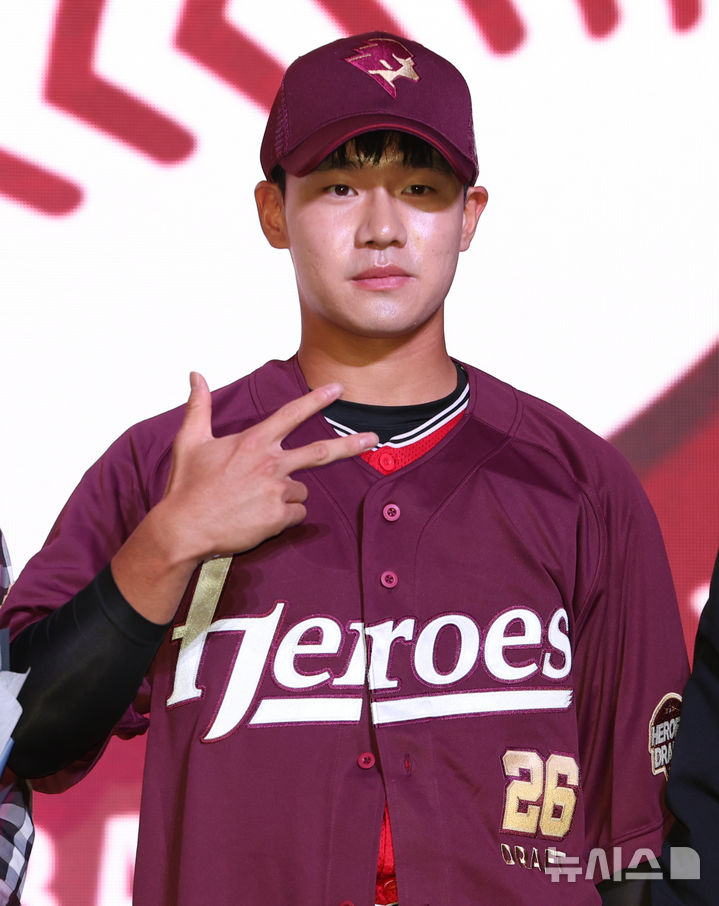 [서울=뉴시스] 황준선 기자 = 17일 오후 서울 송파구 롯데호텔월드에서 열린 2026 KBO 신인 드래프트에서 키움 히어로즈 1라운드 지명된 전주고 박한결이 기념촬영을 하고 있다. 2025.09.17. [email protected]