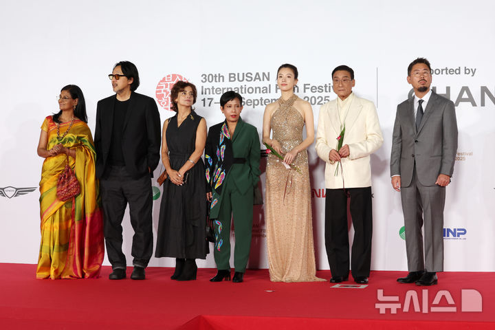 [부산=뉴시스] 박진희 기자 = 제30회 부산국제영화제 경쟁부분 심사위원장 나홍진 감독, 심사위원 홍콩 배우 양가휘, 인도 배우 겸 감독 난디타 다스, 이란 여성 감독 마르지예 메쉬키니, 영화 감독 코고나다, 인도네시아 프로듀서 율리아 에비나 바하라, 배우 한효주가  17일 부산 해운대구 영화의전당에서 제30회 부산국제영화제 개막식 레드카펫 행사에 참석하고 있다. 2025.10.17. [email protected]