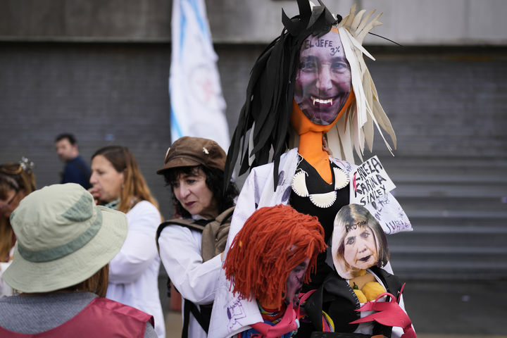 [부에노스아이레스=AP/뉴시스] 17일(현지 시간) 아르헨티나 부에노스아이레스 의사당 밖에서 한 시위 참가자가 하비에르 밀레이 대통령의 여동생인 카리나 밀레이 대통령 비서실장을 악마화한 허수아비를 들고 소아 진료 및 국립 대학 예산 법안에 대한 대통령 거부권 철회를 요구하는 집회에 합류하고 있다. 2025.09.18.