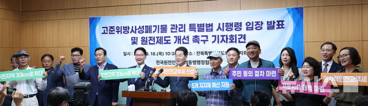 [전주=뉴시스] 김얼 기자 = 심덕섭(가운데 왼쪽) 고창군수와 권익현(가운데) 부안군수를 비롯한 전국원전인근지역동맹행정협의회 관계자들이 18일 전북 전주시 전북특별자치도의회에서 '고준위방사성폐기물 관리 특별법 시행령 입장 발표 및 원전제도 개선 촉구' 기자회견을 열고 구호를 외치고 있다. 2025.09.18. [email protected]
