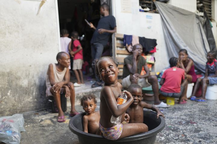 [포르토프랭스=AP/뉴시스] 17일(현지 시간) 아이티 포르토프랭스에서 갱단 폭력으로 삶의 터전을 잃고 임시 대피소에서 살아가는 어린이들이 물놀이를 하고 있다. 2025.09.18.
