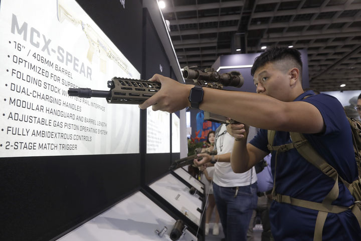[타이베이=AP/뉴시스] 18일(현지 시간) 대만 타이베이 난강 전시센터에서 열린 2025 대만항공우주 및 방위산업 전시회(TADTE)에서 한 남성이 돌격소총 'MCX-스피어'(MCX-SPEAR)를 조작하고 있다. 2025.09.18.