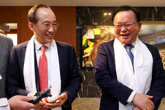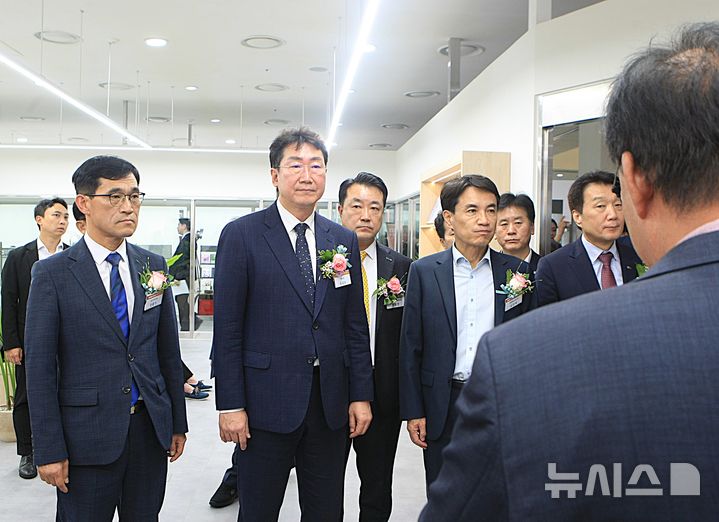 [원주=뉴시스] 이덕화 기자 = 18일 국내 의료기기 산업의 중심지 원주에서 '제21회 강원의료기기전시회(GMES 2025)'가 열린 가운데 (왼쪽부터)조용기 원주시의장, 원강수 원주시장, 김진태 도지사, 한종현 원주의료기기산업진흥원장(오른쪽)이 참가기업 부스를 둘러보고 있다. 2025.09.18. [email protected]