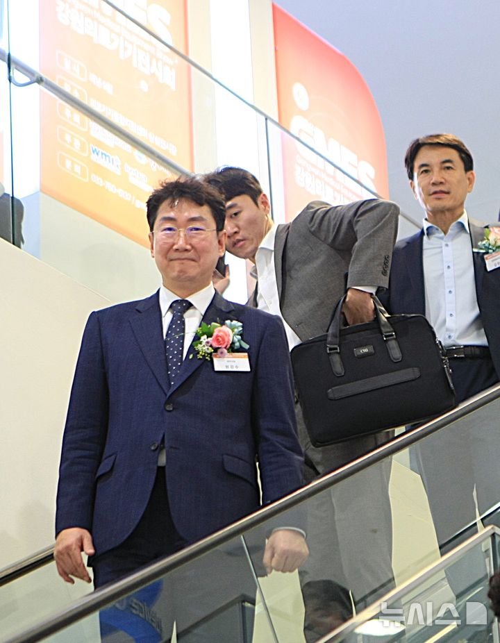 [원주=뉴시스] 이덕화 기자 = 18일 국내 의료기기 산업의 중심지 원주에서 '제21회 강원의료기기전시회(GMES 2025)'가 열린 가운데 원강수 원주시장(앞)과 김진태 도지사(뒤)가 참가기업 부스를 둘러보고 있다. 2025.09.18. [email protected]