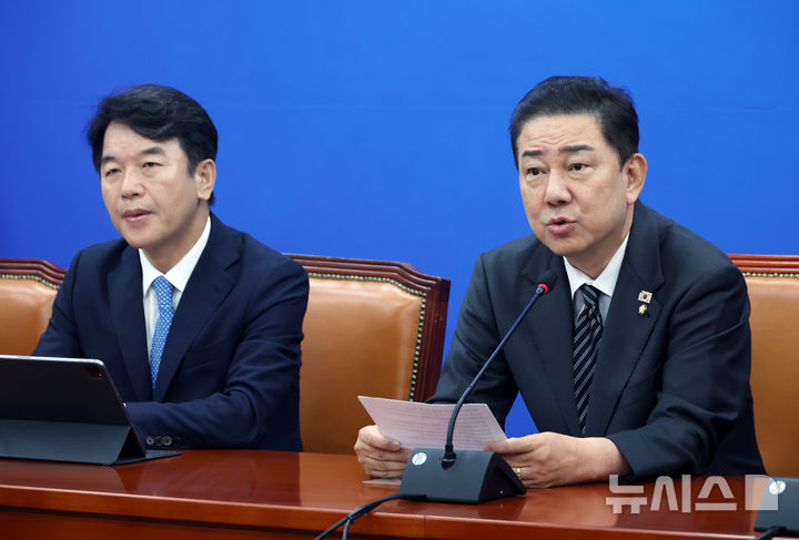 [서울=뉴시스] 고승민 기자 = 김병기 더불어민주당 원내대표가 18일 서울 여의도 국회에서 열린 정책조정회의에서 발언하고 있다. 2025.09.18. [email protected]