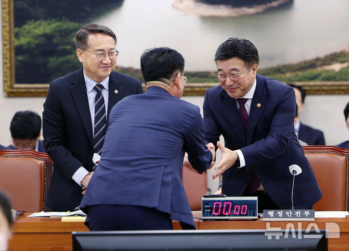 [서울=뉴시스] 김명년 기자 = 윤호중 행정안전부 장관이 17일 오전 서울 여의도 국회에서 열린 산불피해지원대책특별위원회 전체회의에서 김정호 위원장과 악수하고 있다. 2025.09.18. [email protected]