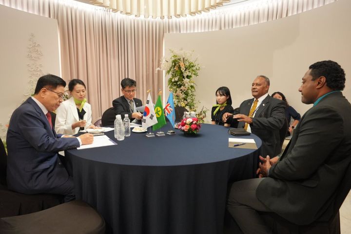 [서울=뉴시스] 김광림(왼쪽) 새마을운동중앙회장이 18일 경북 라한셀렉트 경주에서 피지 사키아시 라이세부 디토카 농어촌개발·재난관리부 장관과 협력 방안을 논의하고 있다. (사진=새마을운동중앙회 제공) 2025.09.18. [email protected] *재판매 및 DB 금지