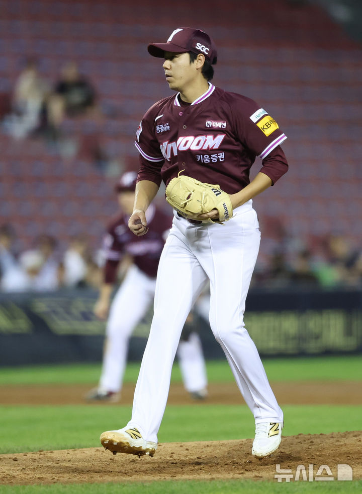 [서울=뉴시스] 조성우 기자 = 18일 오후 서울 송파구 잠실야구장에서 열린 2025 KBO리그 키움 히어로즈와 두산 베어스의 경기, 키움 선발투수 하영민이 두산 7회말 공격 2사 후 이유찬을 삼진아웃 시키고 있다. 2025.09.18. [email protected]