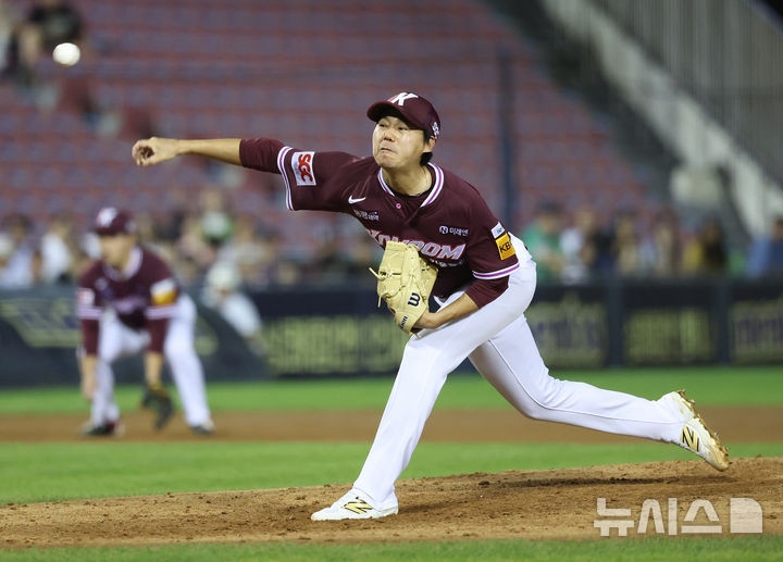 [서울=뉴시스] 조성우 기자 = 18일 오후 서울 송파구 잠실야구장에서 열린 2025 KBO리그 키움 히어로즈와 두산 베어스의 경기, 키움 선발투수 하영민이 두산 7회말 공격 때 마운드에 올라 역투하고 있다. 2025.09.18. [email protected]