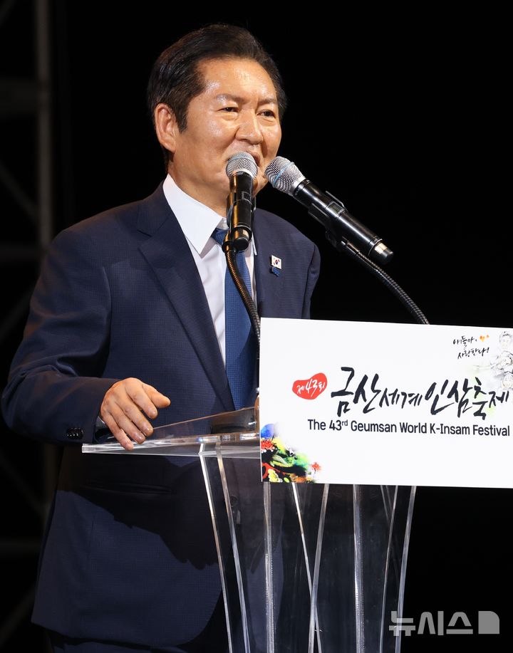 [금산=뉴시스] 조명휘 기자 = 정청래 더불어민주당 대표가 19일 오후 충남 금산군 금산읍 금산세계인삼엑스포 광장에서 열린 제43회 금산세계인삼축제 개막식에 참석해 인사말을 하고 있다. 2025.09.19. [email protected]