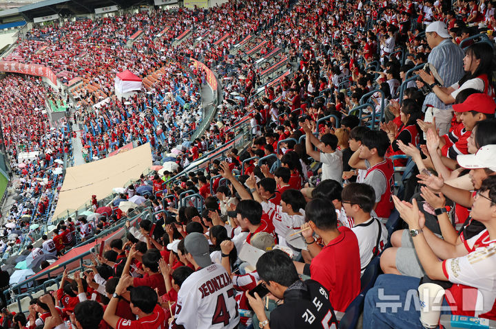 [서울=뉴시스] 조성우 기자 = 19일 서울 송파구 잠실야구장에서 열린 2025 정기 고려대학교·연세대학교 친선경기대회(고연전) 야구 경기에서 고려대 학생들이 응원전을 펼치고 있다.
