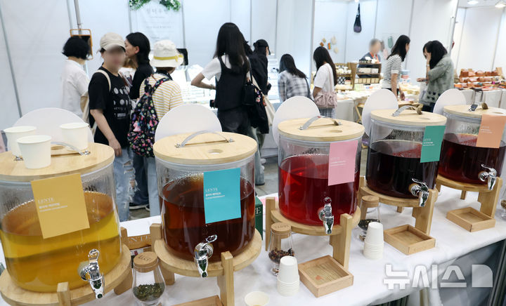 [부산=뉴시스] 하경민 기자 = '2025 부산카페쇼'가 열린 19일 부산 해운대구 벡스코 제1전시장을 찾은 시민들이 다양한 차를 시음하고 있다.