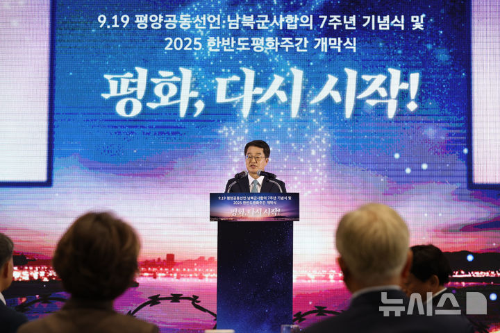 [서울=뉴시스] 국회사진기자단 = 김동연 경기도지사가 19일 경기도 파주 캠프 그리브스에서 열린 9.19 평양공동선언 남북군사합의 7주년 기념식 및 2025 한반도 평화주간 개막식에서 축사를 하고 있다. 2025.09.19. [email protected]