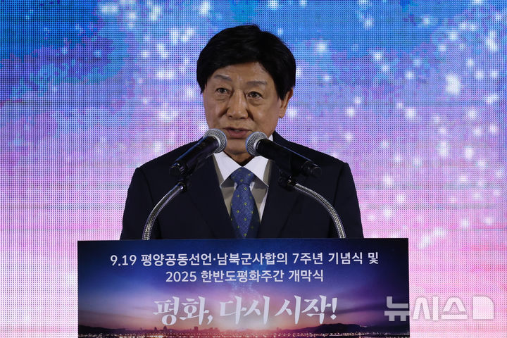 [서울=뉴시스] 국회사진기자단 = 차성수 노무현재단 이사장이 19일 오후 경기 파주 캠프그리브스에서 열린 9·19 평양공동선언 7주년 기념식에서 환영사를 하고 있다.2025.09.19. [email protected]