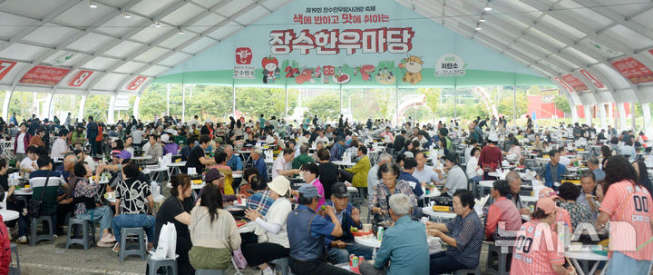 [장수=뉴시스] 김얼 기자 = 제19회 장수한우랑사과랑 축제 개막식이 열린 19일 전북 장수군 의암공원 축제장을 찾은 시민들로 장내가 북적이고 있다. 2025.09.19. [email protected]