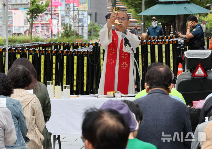 [서울=뉴시스] 배훈식 기자 = 천주교정의평화위원회 하성용 신부와 신자들이 20일 오후 서울 종로구 평화의 소녀상 인근에서 을사늑약 120주년·광복 80주년 인권 생명 평화 미사를 하고 있다. 2025.09.20. [email protected]