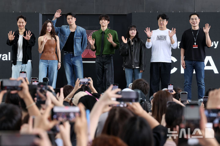 [부산=뉴시스] 박진희 기자 = 영화 '짱구' 감독·배우 정우, 배우 정수정, 신승호, 조범규, 권소현, 현봉식, 감독 오성호가 20일 부산 해운대구 영화의전당 BIFF 야외무대에서 제30회 부산국제영화제 오픈토크를 하고 있다. 2025.09.20. [email protected]