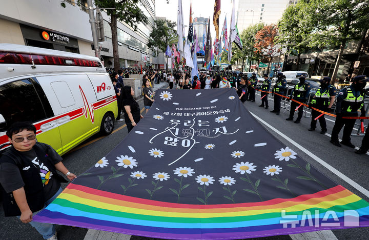 [대구=뉴시스] 이무열 기자 = 20일 대구 중구 국채보상로 일대에서 열린 제17회 대구퀴어문화축제에서 참가자들이 거리 퍼레이드를 하고 있다. 2025.09.20. [email protected]